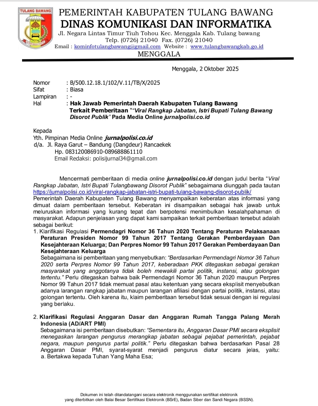 TULANGBAWANG – Surya Galang com–Polemik baru mencuat di Kabupaten Tulang Bawang setelah beredar surat elektronik dari Dinas Komunikasi dan Informatika (Diskominfo) setempat yang ditujukan kepada beberapa media. Surat bertanggal Kamis,(02/10/2025) itu diberi perihal “Hak Jawab Pemerintah Kabupaten Tulang Bawang Terkait Pemberitaan Rangkap Jabatan” yang menyoroti posisi Ketua TP-PKK Tulang Bawang yang juga menjabat Ketua PMI serta Ketua PERWOSI Tulang Bawang.