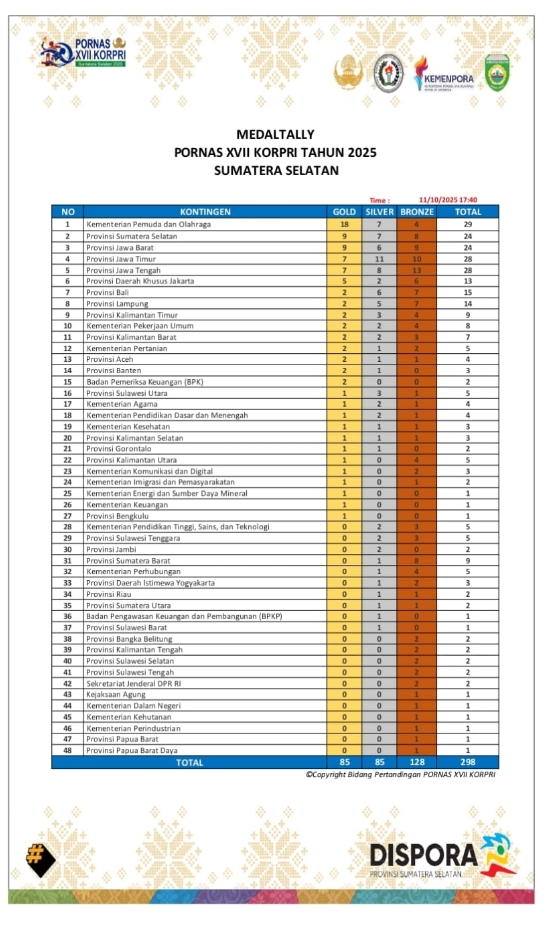 Palembang –Surya Galang com- Semangat juang dan dedikasi tinggi aparatur sipil negara (ASN) asal Sai Bumi Ruwa Jurai kembali berbuah manis. Kontingen Lampung sukses menorehkan prestasi gemilang dalam Pekan Olahraga Nasional Korpri (Pornas Korpri) XVII Tahun 2025 yang digelar di Palembang, Sabtu (11/10/2025).